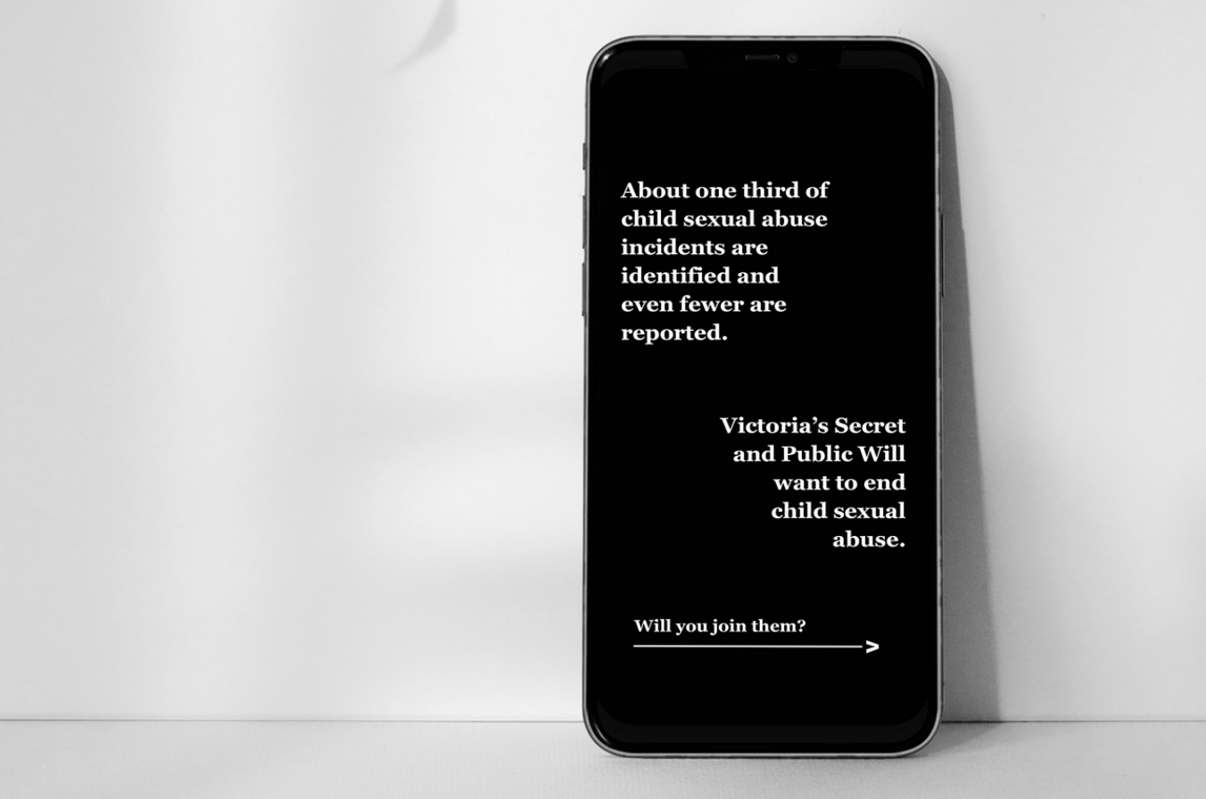 Idea: A collaboration between Victoria’s Secret and Public Will where a child mannequin dressed in sexy lingerie is placed within a normal lingerie display in the store. On the child mannequin’s lingerie there will be a tag with the statement “Does this bother you? It’s about time someone noticed.” and a QR code leading to a website that speaks more about child sexual abuse.